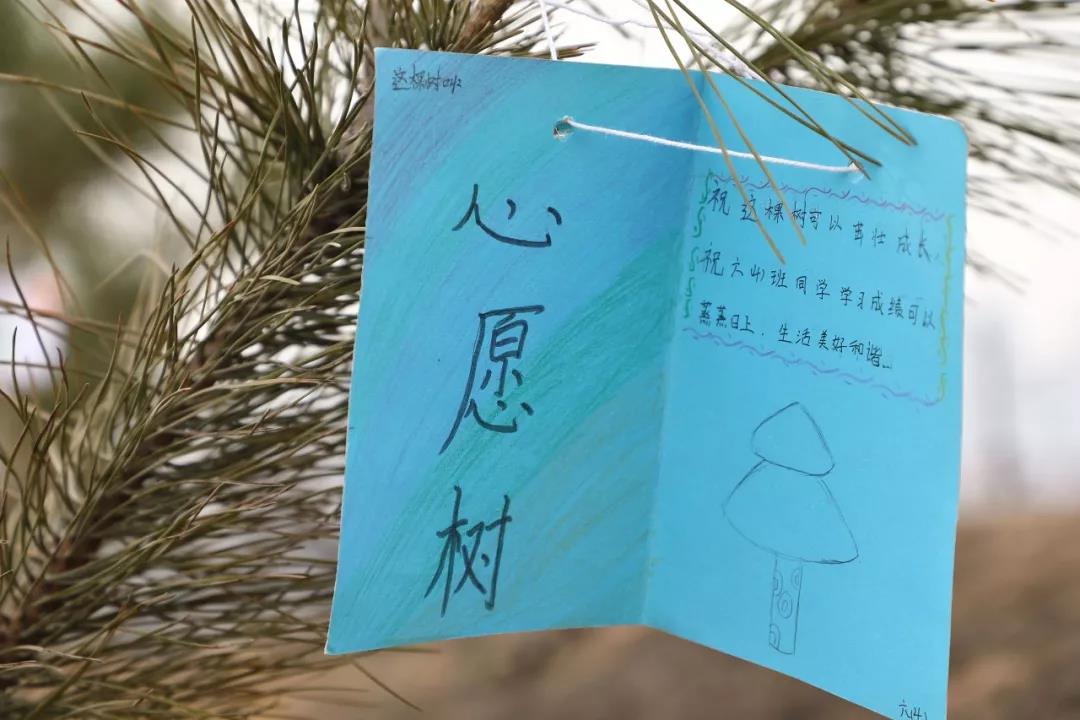 种植一份希望,梦想一片未来。以班级为单位,每班的学生把写有寄语的心愿卡系在了自己栽种的松树上。从学生微笑的脸庞上,我们能感受到他们满满的喜悦和成就感。